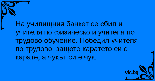 На училищния банкет се сбил и учителя по физическо и учителя по трудово обучение. Победил учителя по трудово, защото каратето си е карате, а чукът си е чук.