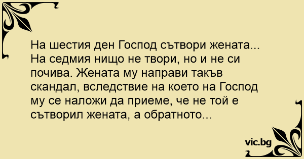 На седмия нищо не твори, но и не си почива. Жената му направи такъв скандал, вследствие на което на Господ му се наложи да приеме, че не той е сътворил жената, а обратното...