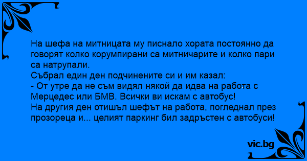 На другия ден отишъл шефът на работа, погледнал през прозореца и... целият паркинг бил задръстен с автобуси!