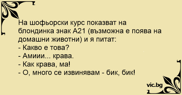На шофьорски курс показват на блондинка знак А21 (възможна е поява на домашни животни) и я питат: