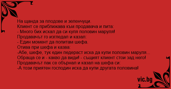 -Абе, шефе, тук един пeдepact иска да купи половин маруля...