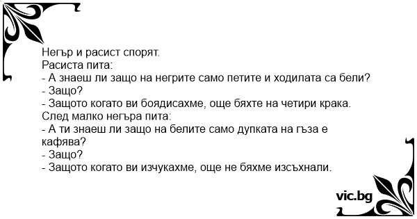 - А знаеш ли защо на негрите само петите и ходилата са бели?