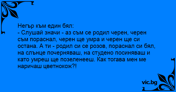 - Слушай значи - аз съм се родил черен, черен съм пораснал, черен ще умра и черен ще си остана. А ти - родил си се розов, пораснал си бял, на слънце почерняваш, на студено посиняваш и като умреш ще позеленееш. Как тогава мен ме наричаш цветнокож?!
