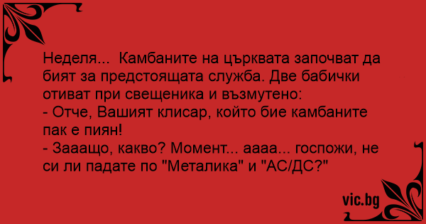 Неделя... Камбаните на църквата започват да бият за предстоящата служба. Две бабички отиват при свещеника и възмутено: