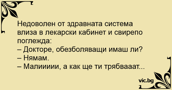 Недоволен от здравната система влиза в лекарски кабинет и свирепо поглежда: