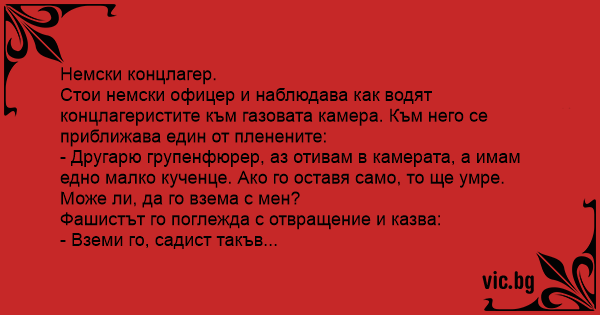 - Другарю групенфюрер, аз отивам в камерата, а имам едно малко кученце. Ако го оставя само, то ще умре. Може ли, да го взема с мен?