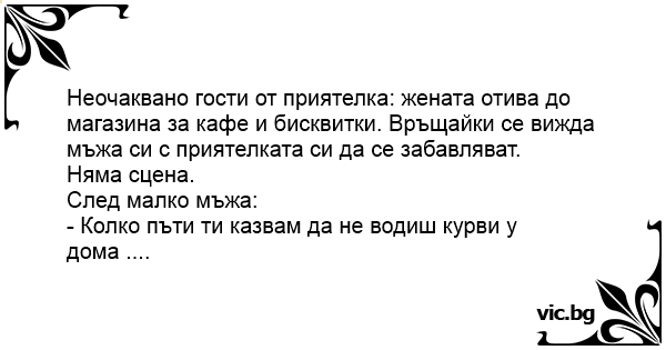 Неочаквано гости от приятелка: жената отива до магазина за кафе и бисквитки. Връщайки се вижда мъжа си с приятелката си да се забавляват.