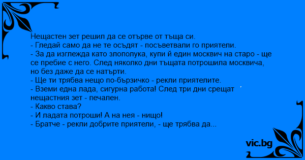 - За да изглежда като злополука, купи й един москвич на старо - ще се пребие с него. След няколко дни тъщата потрошила москвича, но без даже да се натърти.