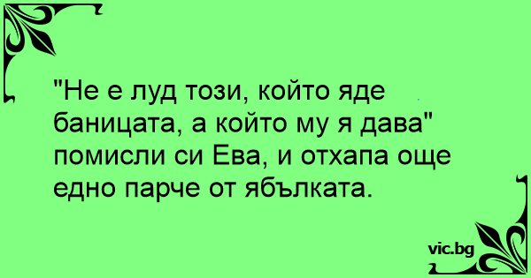 "Не е луд този, който яде баницата, а който му я дава" помисли си Ева, и отхапа още едно парче от ябълката.