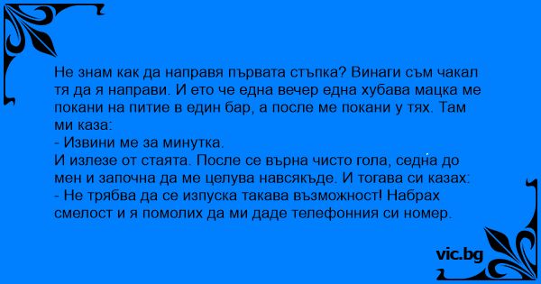 Не знам как да направя първата стъпка? Винаги съм чакал тя да я направи. И ето че една вечер една хубава мацка ме покани на питие в един бар, а после ме покани у тях. Там ми каза: