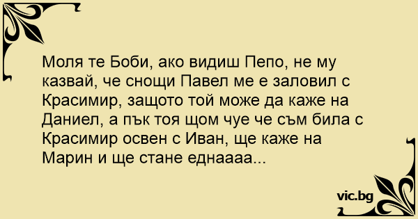 Моля те Боби, ако видиш Пепо, не му казвай, че снощи Павел ме е заловил с Красимир, защото той може да каже на Даниел, а пък тоя щом чуе че съм била с Красимир освен с Иван, ще каже на Марин и ще стане еднаааа...