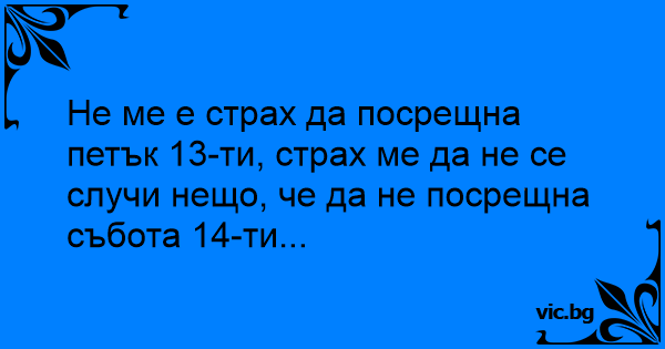 Не ме е страх да посрещна петък 13-ти, страх ме да не се случи нещо, че да не посрещна събота 14-ти...
