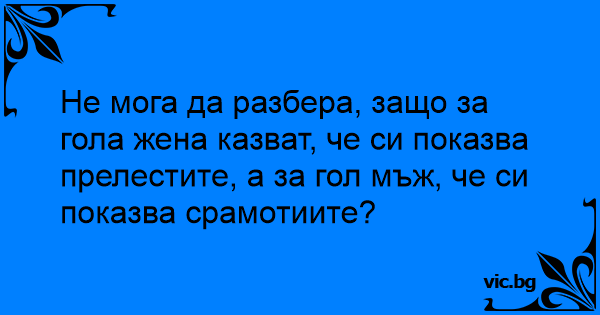 Не мога да разбера, защо за гола жена казват, че си показва прелестите, а за гол мъж, че си показва срамотиите?