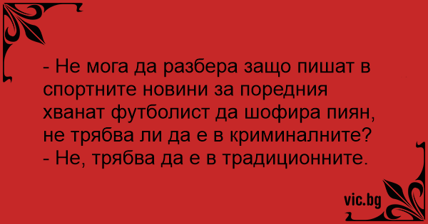 - Не мога да разбера защо пишат в спортните новини за поредния хванат футболист да шофира пиян, не трябва ли да е в криминалните?