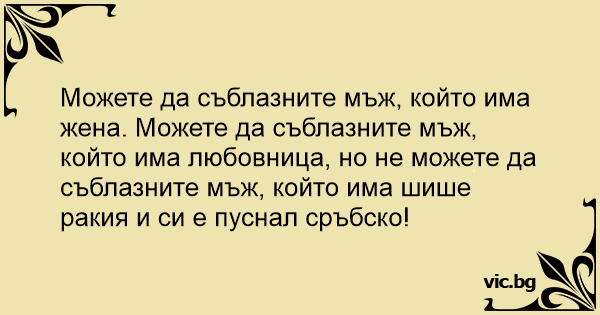 Можете да съблазните мъж, който има жена. Можете да съблазните мъж, който има любовница, но не можете да съблазните мъж, който има шише ракия и си е пуснал сръбско!