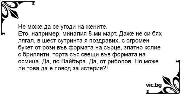 Ето, например, миналия 8-ми март. Даже не си бях лягал, в шест сутринта я поздравих, с огромен букет от рози във формата на сърце, златно колие с брилянти, торта със свещи във формата на осмица. Да, по Вайбъра. Да, от риболов. Но може ли това да е повод за истерия?!