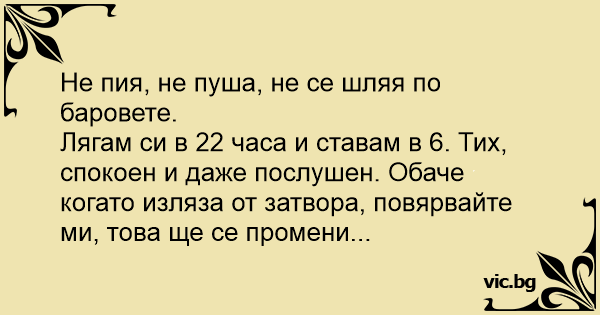 Цветко си збори сам на себе: - Не пиjам. - Не пушам. - Си легнувам во 10 вечер, а станувам во 6 сабајле. - Тивок сум, мирен и послушен... ама кога ќе излезам од затвор, се ќе се смени!