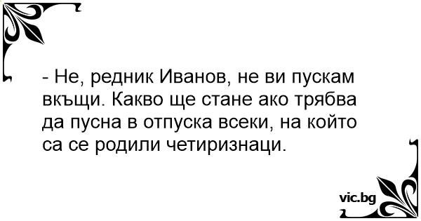 - Не, редник Иванов, не ви пускам вкъщи. Какво ще стане ако трябва да пусна в отпуска всеки, на който са се родили четиризнаци.
