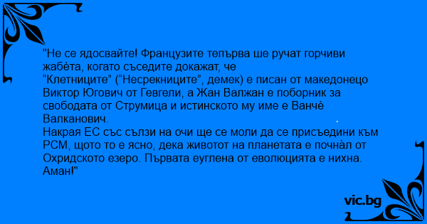 "Не се ядосвайте! Французите тепърва ше ручат горчиви жабѐта, когато съседите докажат, че “Клетниците” (“Несрекниците”, демек) е писан от македонецо Виктор Югович от Гевгели, а Жан Валжан е поборник за свободата от Струмица и истинското му име е Ванчѐ Валканович.