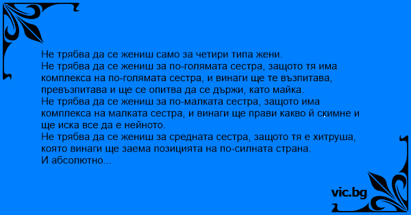 Не трябва да се жениш за по-голямата сестра, защото тя има комплекса на по-голямата сестра, и винаги ще те възпитава, превъзпитава и ще се опитва да се държи, като майка.