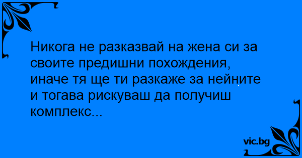 Никога не разказвай на жена си за своите предишни похождения, иначе тя ще ти разкаже за нейните и тогава рискуваш да получиш комплекс...