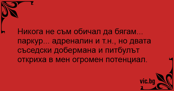 Никога не съм обичал да бягам... паркур... адреналин и т.н., но двата съседски добермана и питбулът откриха в мен огромен потенциал.