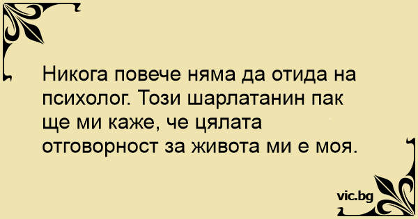 Никога повече няма да отида на психолог. Този шарлатанин пак ще ми каже, че цялата отговорност за живота ми е моя.