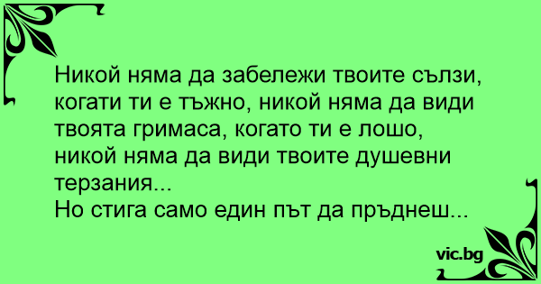 Никой няма да забележи твоите сълзи, когати ти е тъжно, никой няма да види твоята гримаса, когато ти е лошo, никой няма да види твоите душевни терзания...