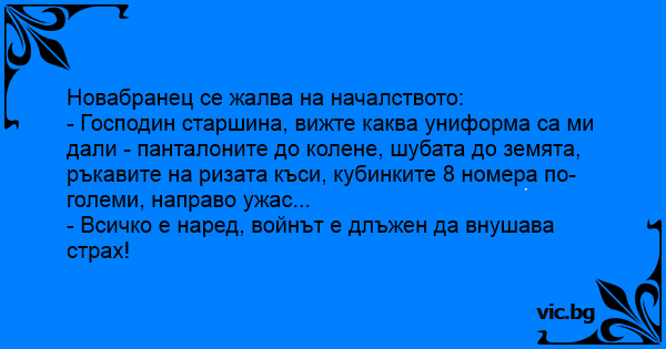 - Господин старшина, вижте каква униформа са ми дали - панталоните до колене, шубата до земята, ръкавите на ризата къси, кубинките 8 номера по-големи, направо ужас...