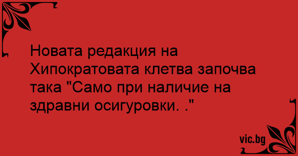 Новата редакция на Хипократовата клетва започва така "Само при наличие на здравни осигуровки. ."