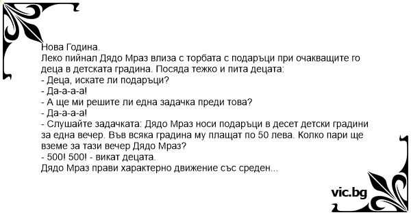 - Слушайте задачката: Дядо Мраз носи подаръци в десет детски градини за една вечер. Във всяка градина му плащат по 50 лева. Колко пари ще вземе за тази вечер Дядо Мраз?