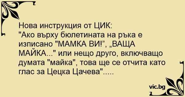 "Ако върху бюлетината на ръка е изписано "МАМКА ВИ!”, „ВАЩА МАЙКА..." или нещо друго, включващо думата "майка", това ще се отчита като глас за Цецка Цачева".....