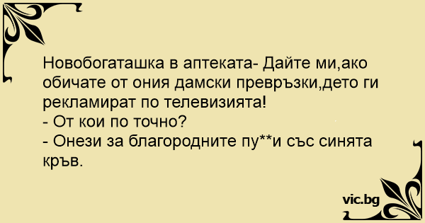 Новобогаташка в аптеката- Дайте ми,ако обичате от ония дамски превръзки,дето ги рекламират по телевизията!
