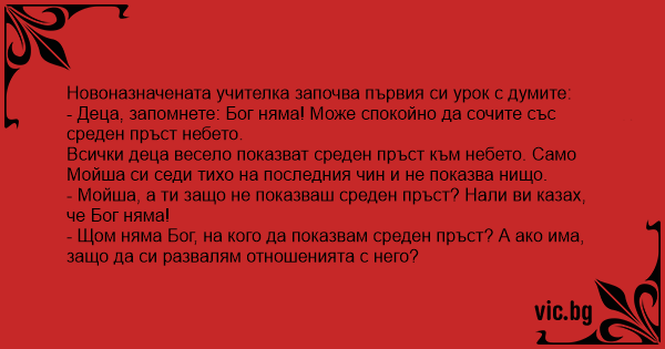 - Деца, запомнете: Бог няма! Може спокойно да сочите със среден пръст небето.