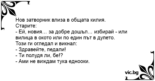 - Ей, новия… за добре дошъл… избирай - или вилица в окото или по един път в дупeto.