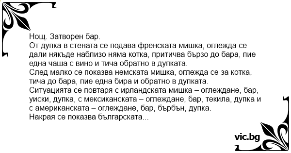Накрая се показва българската мишка, оглежда се, изтичва до бара и изпива една ракия. Оглежда се пак, котката я няма, пие втора, след това оглеждане – няма котка, пие трета, четвърта и след петата сяда на бара изпуква си кокалчетата на пръстите и си мърмори: