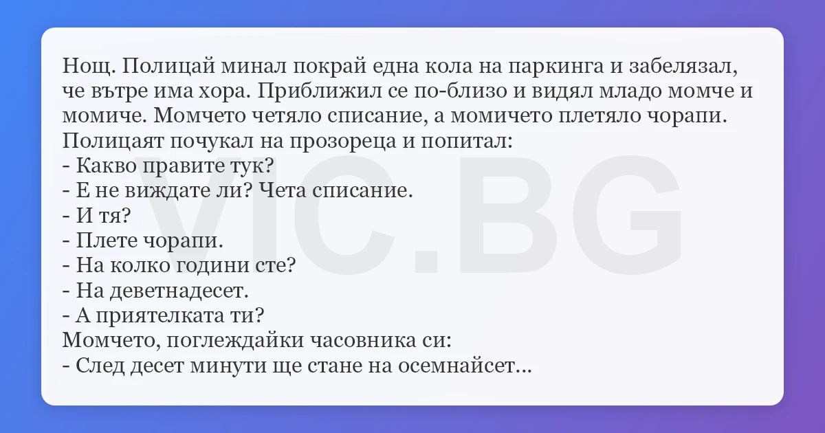 Нощ. Полицай минал покрай една кола на паркинга и забелязал, че вътре има хора. Приближил се по-близо и видял младо момче и момиче. Момчето четяло списание, а момичето плетяло чорапи. Полицаят почукал на прозореца и попитал: - Какво правите тук? - Е не виждате ли? Чета списание. - И тя? - Плете чорапи. - На колко години сте? - На деветнадесет. - А приятелката ти? Момчето, поглеждайки часовника си: - След десет минути ще стане на осемнайсет...