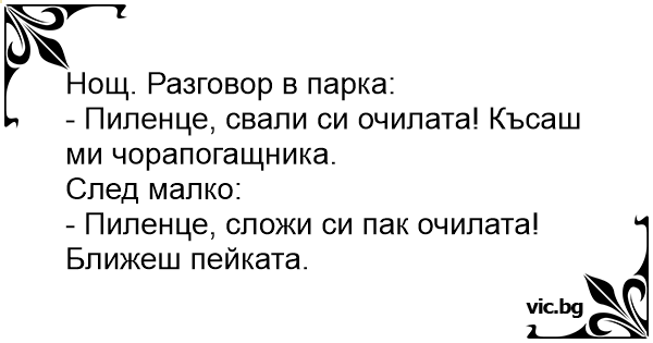 - Пиленце, сложи си пак очилата! Ближеш пейката.