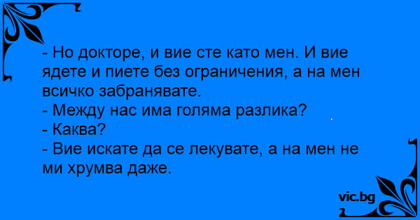 - Но докторе, и вие сте като мен. И вие ядете и пиете без ограничения, а на мен всичко забранявате.