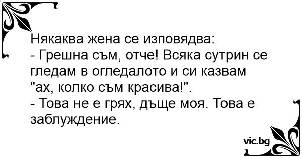 - Грешна съм, отче! Всяка сутрин се гледам в огледалото и си казвам "ах, колко съм красива!".