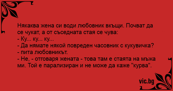 - Не, - отговаря жената - това там е стаята на мъжа ми. Той е парализиран и не може да каже "kуpba".