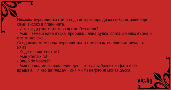 Някаква журналистка отишла да интервюира двама овчари, живеещи сами високо в планината.