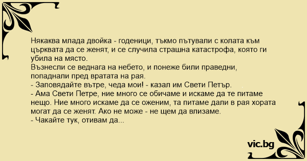 - Ама Свети Петре, ние много се обичаме и искаме да те питаме нещо. Ние много искаме да се оженим, та питаме дали в рая хората могат да се женят. Ако не може - не щем да влизаме.