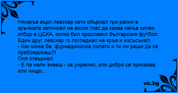 Някакъв върл левскар като обърнал три ракии в кръчмата започнал на висок глас да казва какъв силен отбор е ЦСКА, колко бил прославил българския футбол.