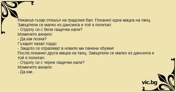 Някакъв гъзар отишъл на градския бал. Поканил една мацка на танц. Завъртели се малко из дансинга и той я попитал: