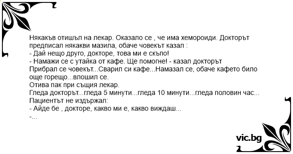 Някакъв отишъл на лекар. Оказало се , че има хемороиди. Докторът предписал някакви мазила, обаче човекът казал :