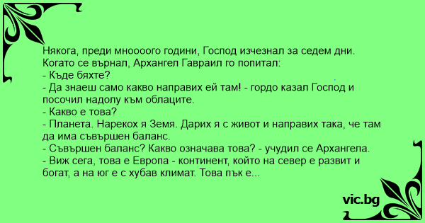 Някога, преди мноооого години, Господ изчезнал за седем дни. Когато се върнал, Архангел Гавраил го попитал: