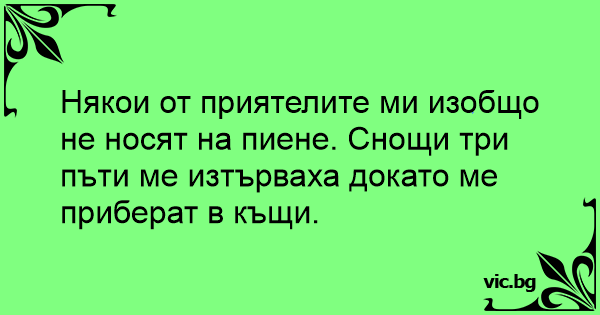 Някои от приятелите ми изобщо не носят на пиене. Снощи три пъти ме изтърваха докато ме приберат в къщи.