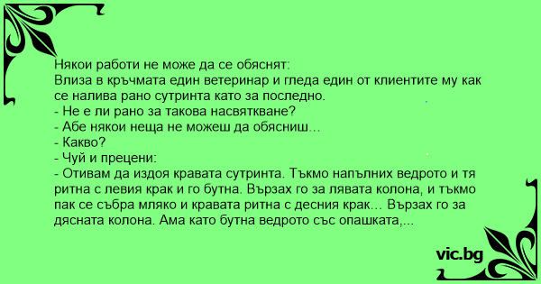 - Отивам да издоя кравата сутринта. Тъкмо напълних ведрото и тя ритна с левия крак и го бутна. Вързах го за лявата колона, и тъкмо пак се събра мляко и кравата ритна с десния крак… Вързах го за дясната колона. Ама като бутна ведрото със опашката, и аз нямам повече въжета. Вързах я със моя колан. В този момент ми падна панталона и жена ми влезе в обора… Някои неща не могат да се обяснят братче, наздраве…