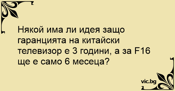 Някой има ли идея защо гаранцията на китайски телевизор е 3 години, а за F16 ще е само 6 месеца?